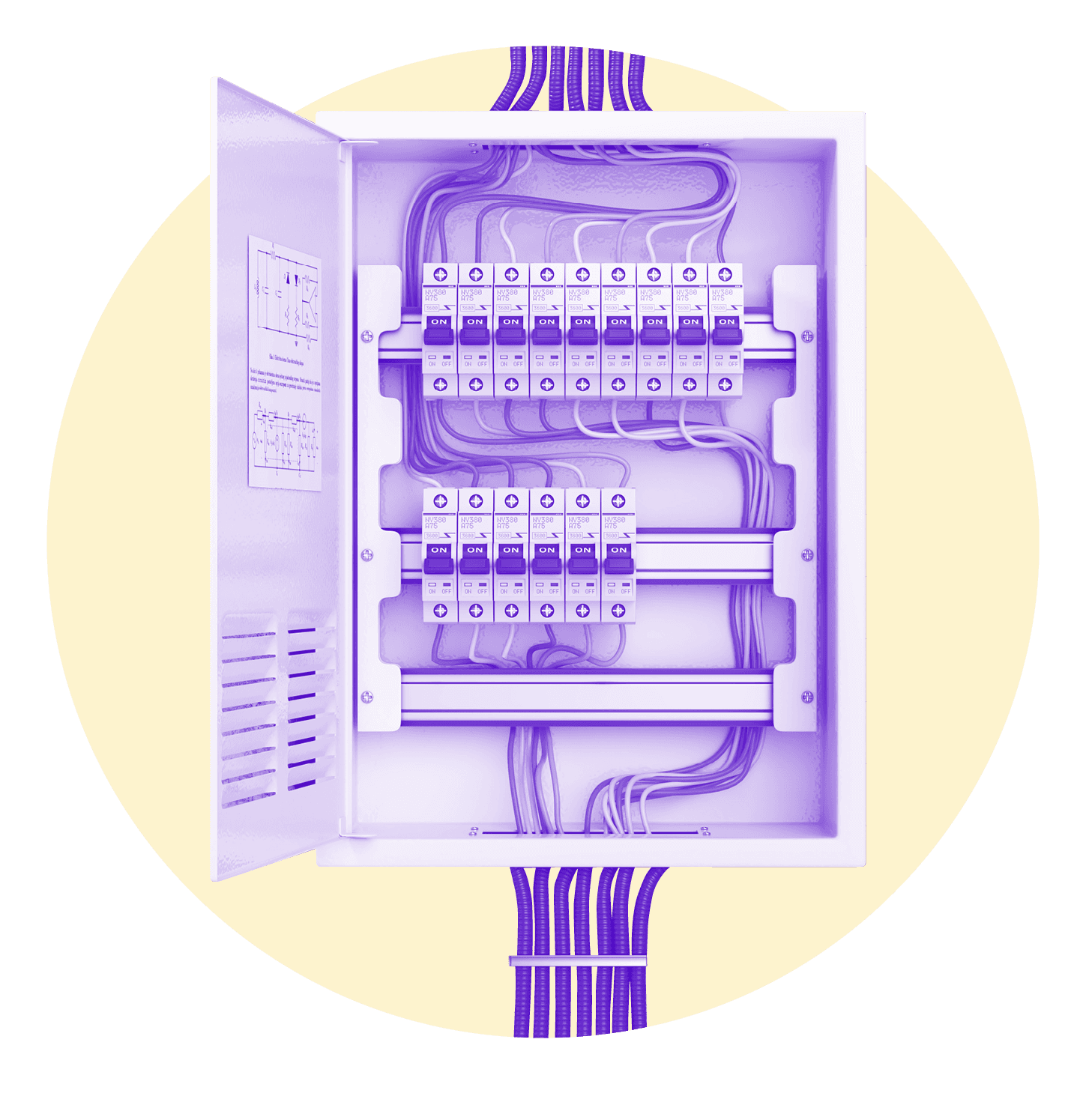 Yellow circle with a purple icon of a portable induction cooktop inside. There is a nonstick pan on top of the cooktop.